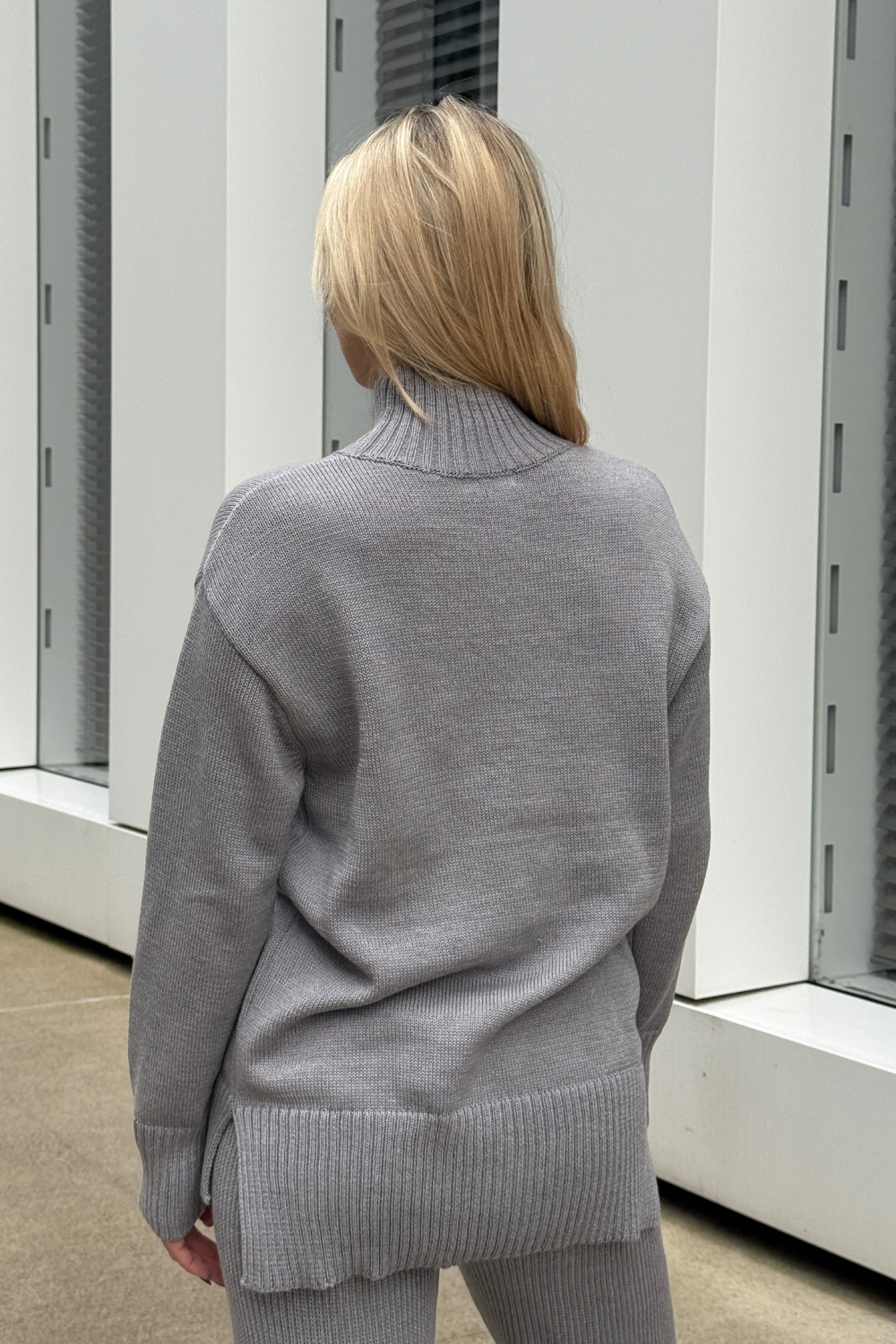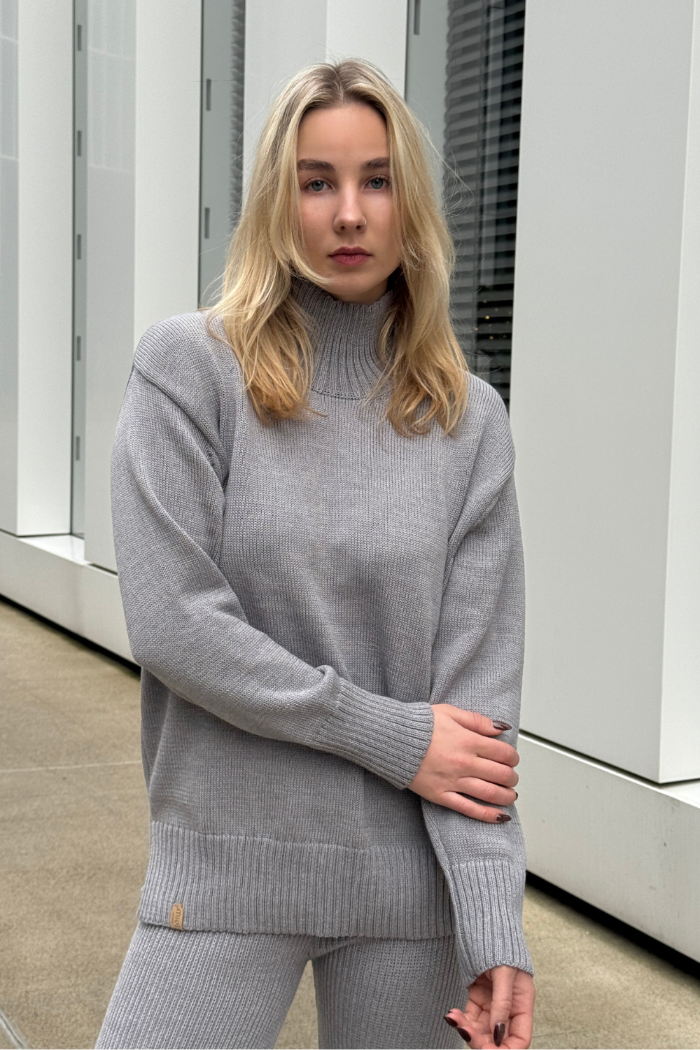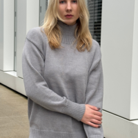 Knitted pure merino wool one size women’s pullover sweater delivers warmth and daily style. Oversized sweater features higher neck, side splits and a bit longer back. Cosy sweater is hand knitted in two different patters.