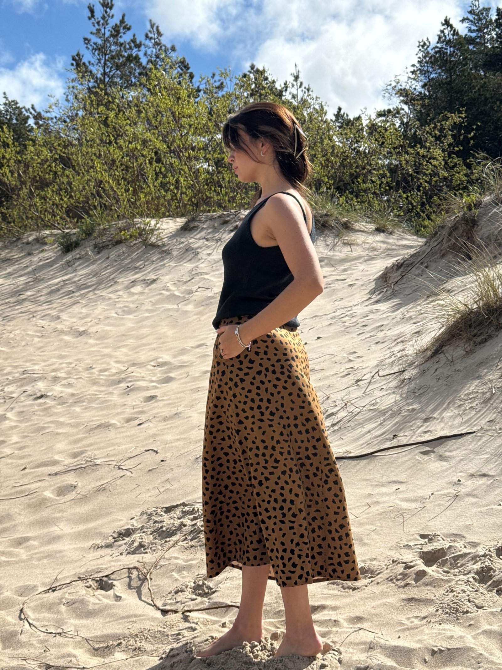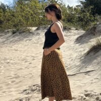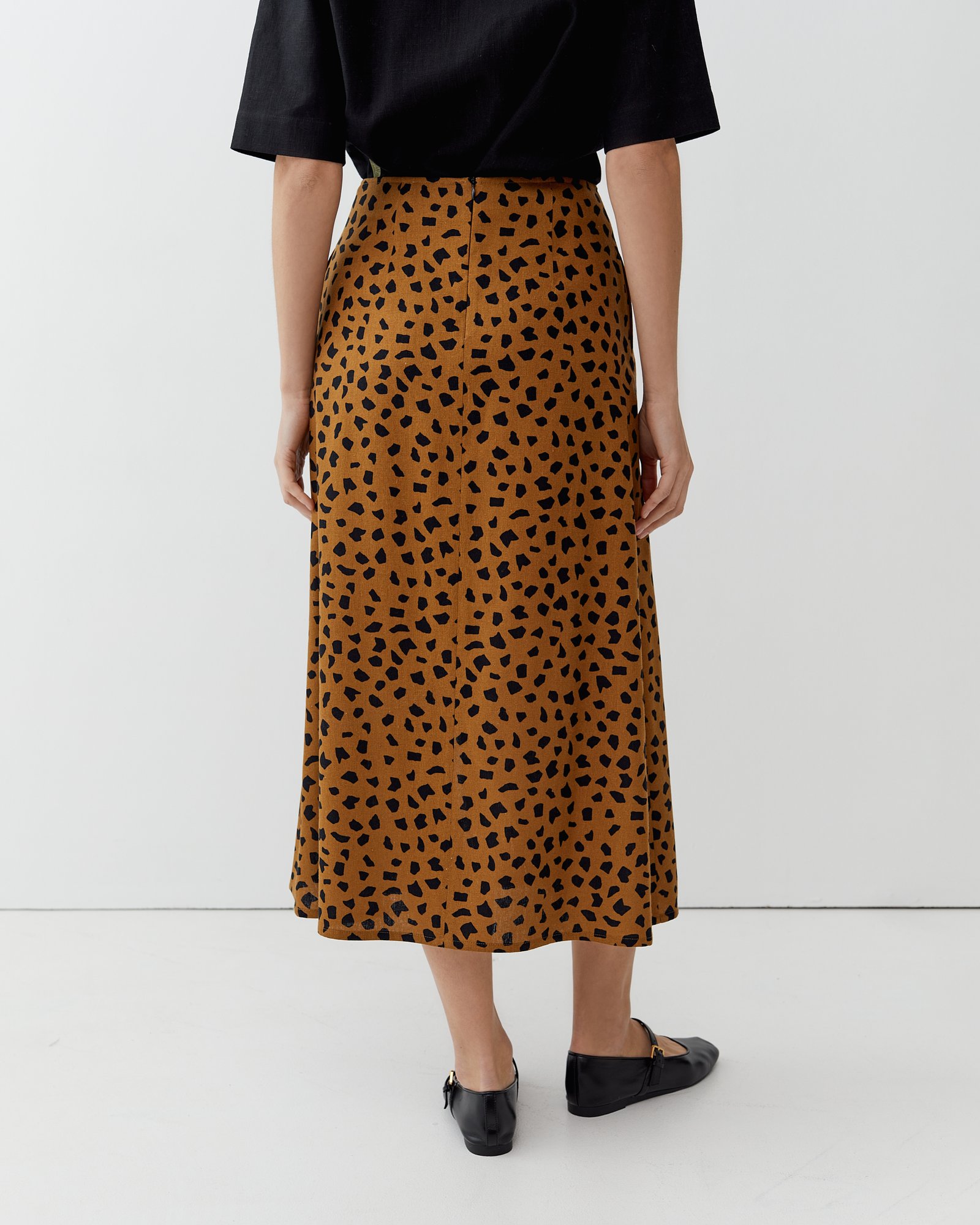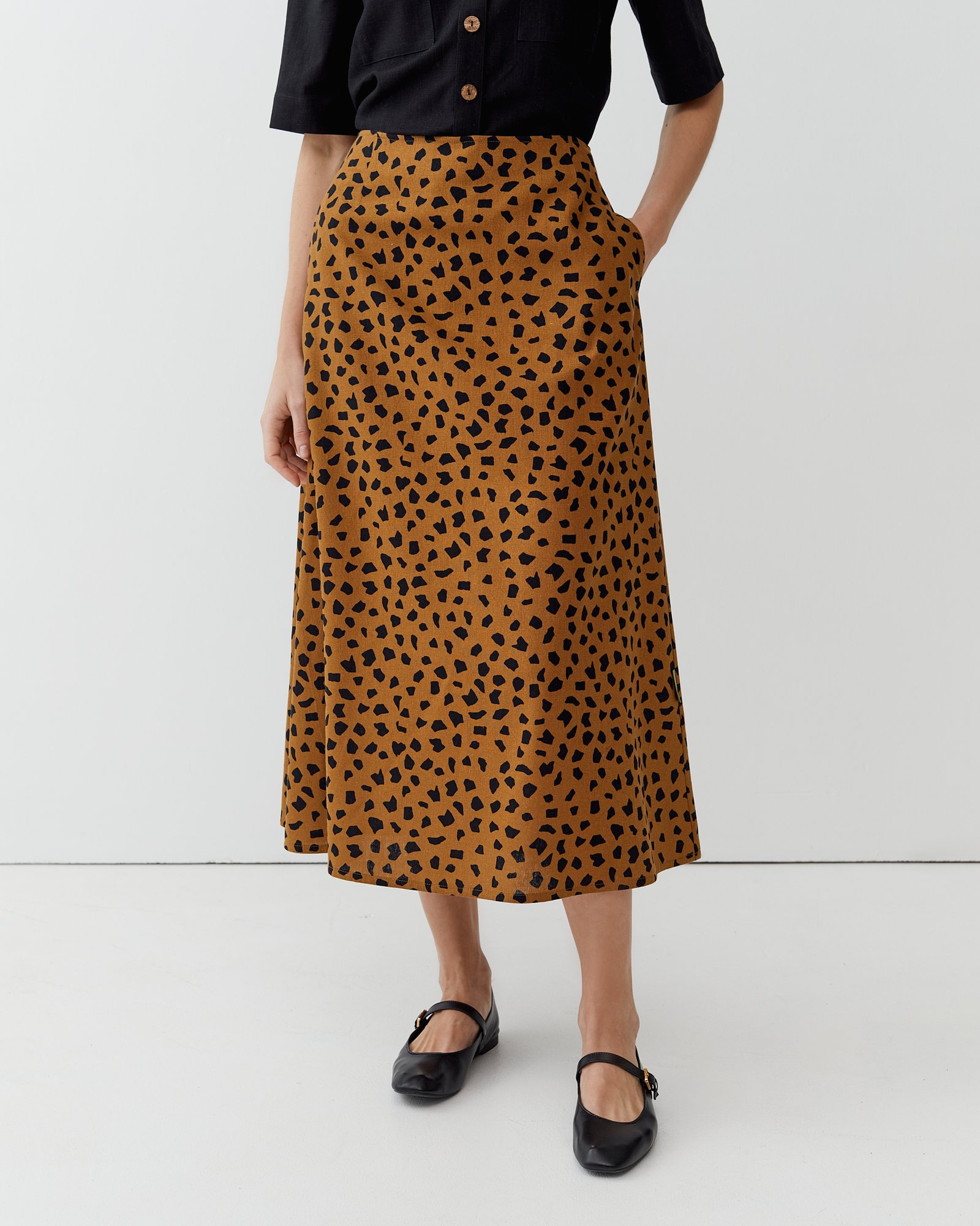 Ilgas, elegantiškas A linijos sijonas su kišenėmis žavi subtiliu raštu ir lengvu, krentančiu audiniu. Nugaroje įsiūtas užtrauktukas patogiam užsegimui.