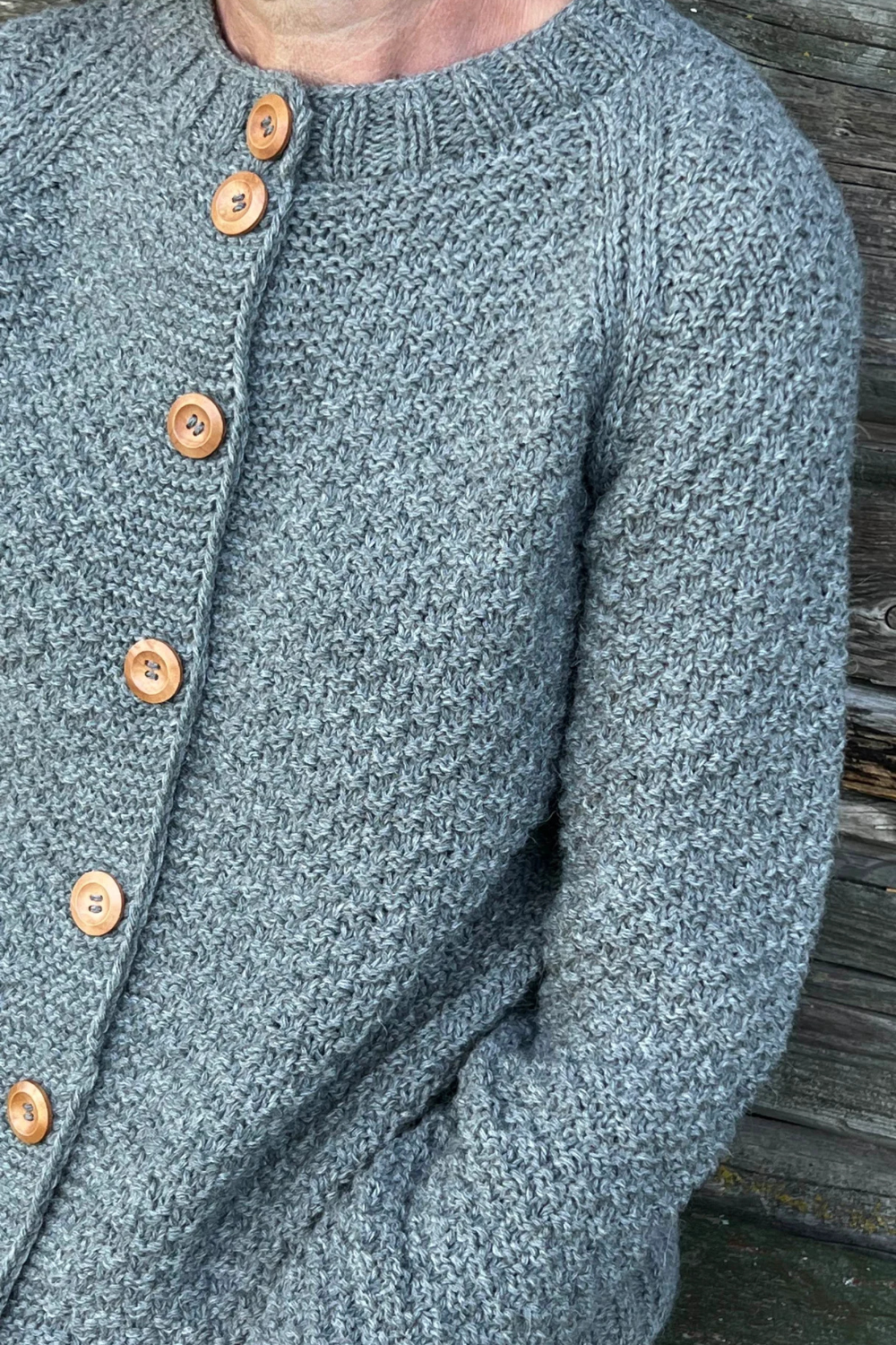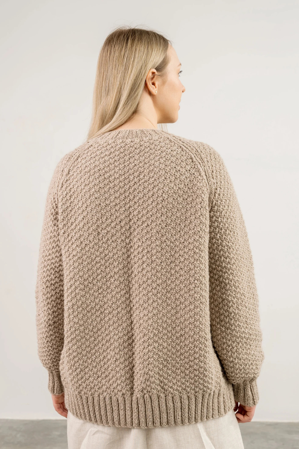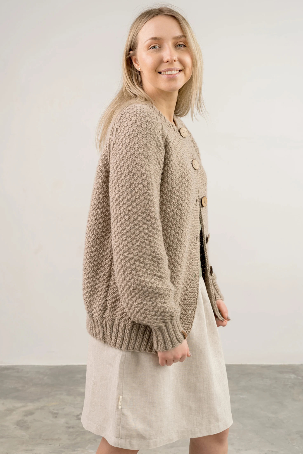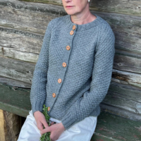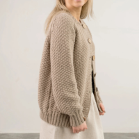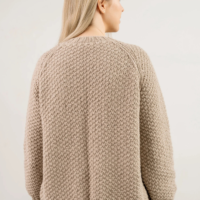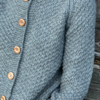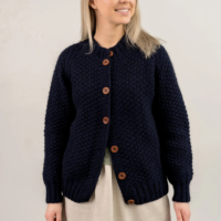 Rankomis megztas, unikalaus rašto megztinis iš merino, alpakos, moheros vilnos siūlų sukuria vintažinę ir nostalgišką nuotaiką. Ilgaamžis kardiganas turi apvalią apykaklę, sagas.
