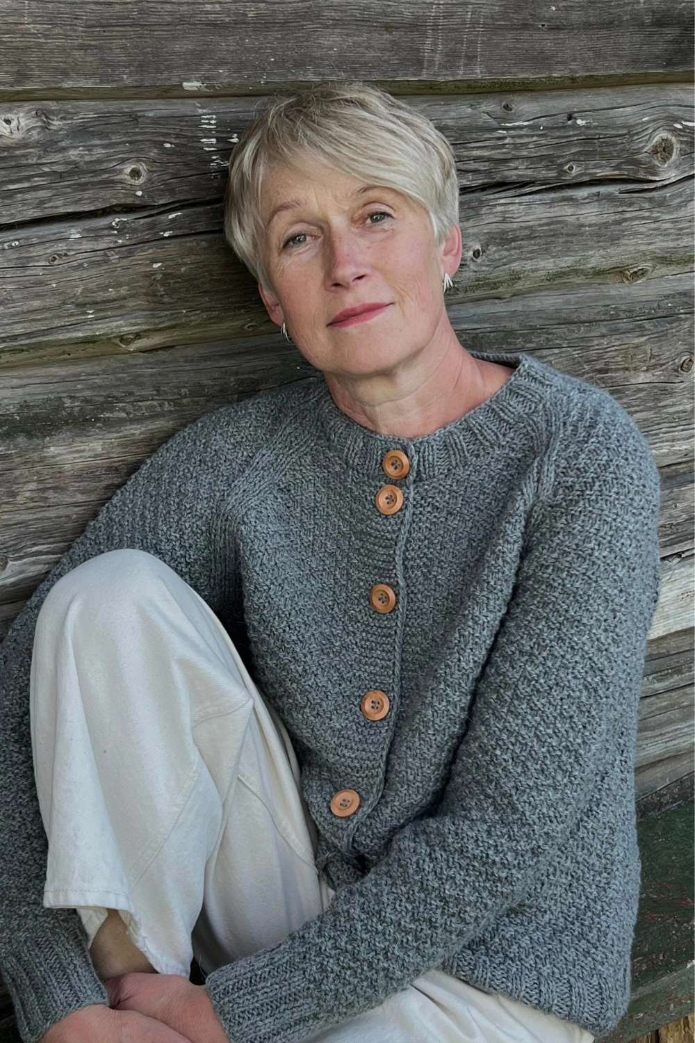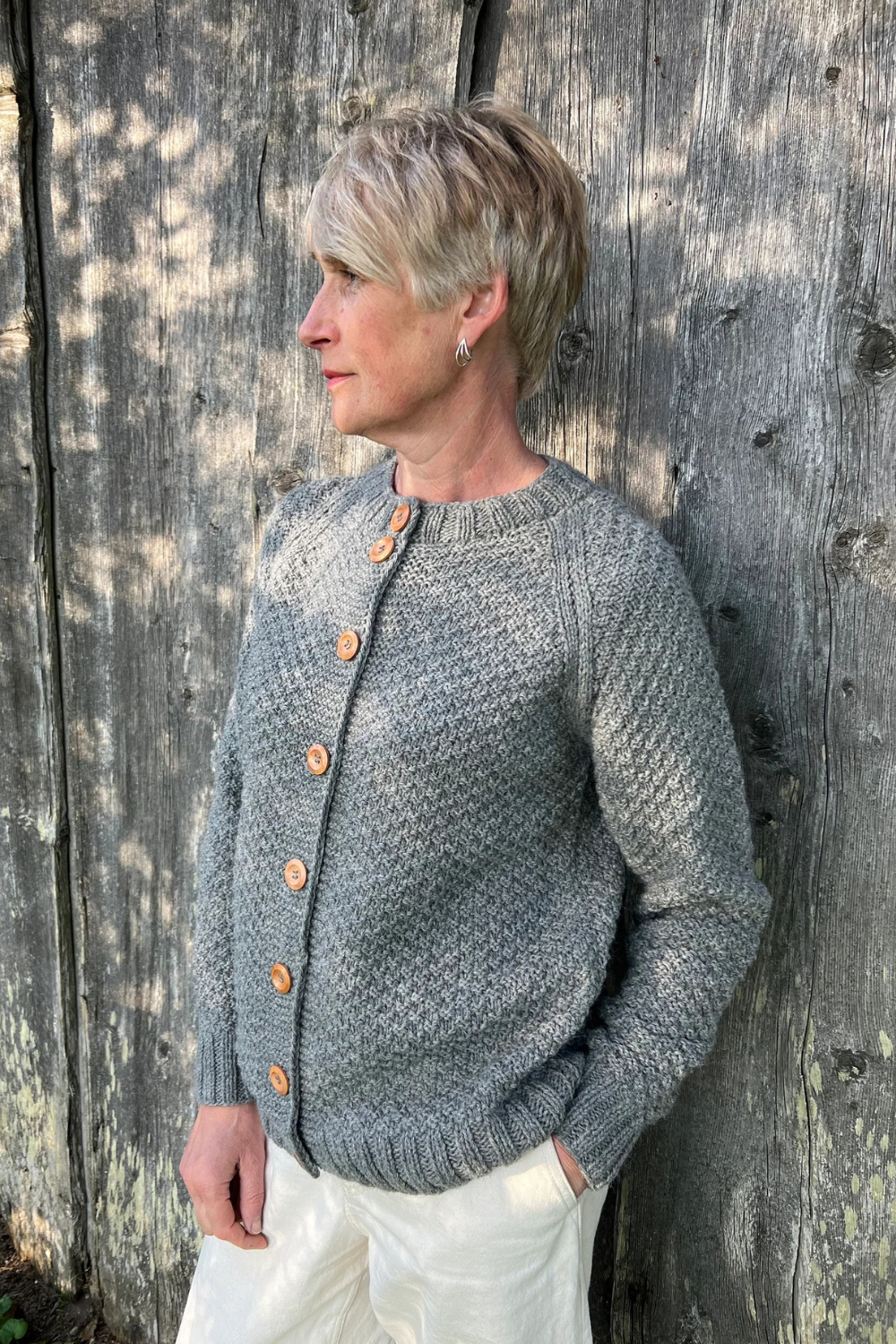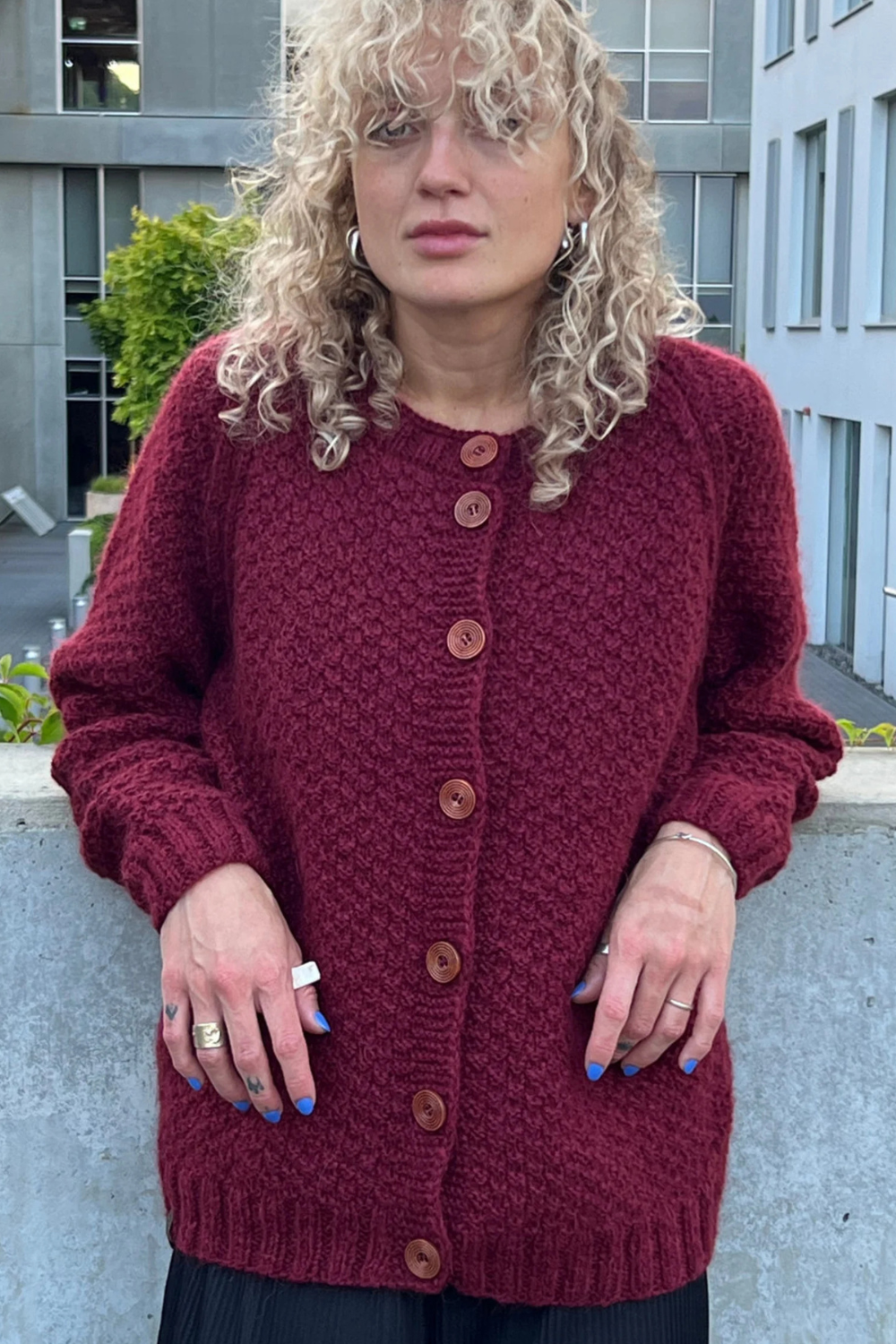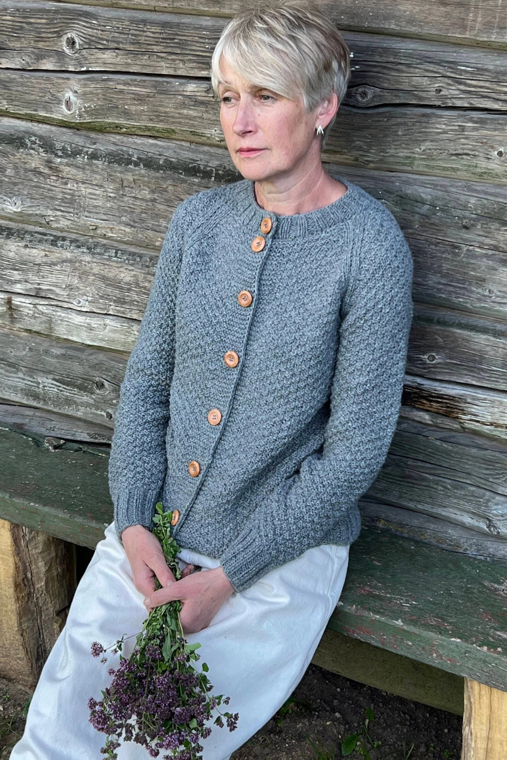 Rankomis megztas, unikalaus rašto megztinis iš merino, alpakos, moheros vilnos siūlų sukuria vintažinę ir nostalgišką nuotaiką. Ilgaamžis kardiganas turi apvalią apykaklę, sagas.